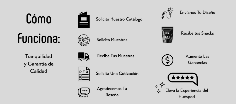 Queremos que prueben de primera mano los snacks más vendidos en hoteles de lujo en México y que conozcan los diferentes empaques que podemos personalizar para su marca.