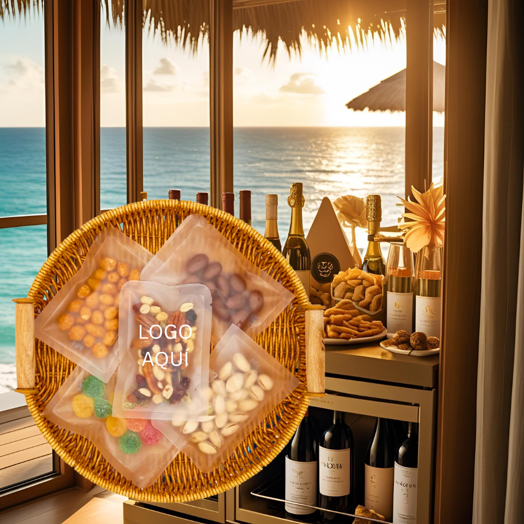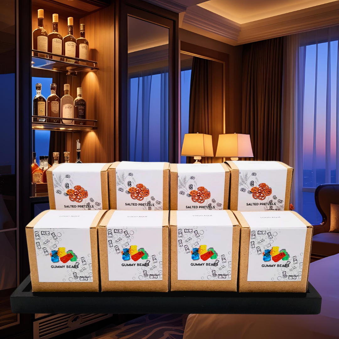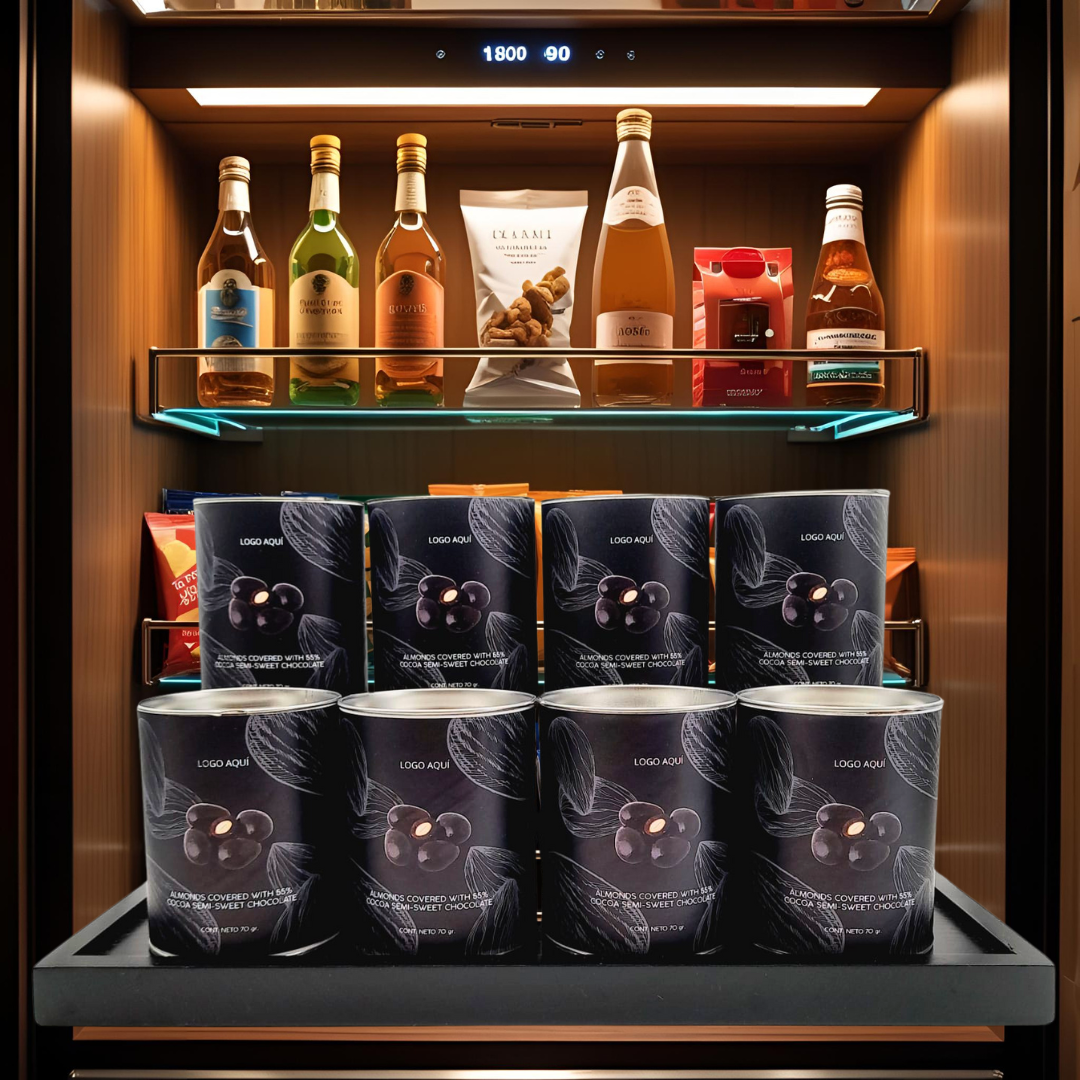 Los snacks con empaque personalizado aumentan hasta un 20% las ventas del minibar de las habitaciones (Hospitality Net, 2019) y elevan la percepción de lujo entre tus huéspedes.