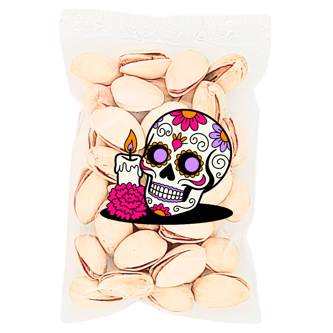 - 100 pzas de Pistaches salados de 50gr. en bolsa transparente 100% reciclable (tipo celofán), personalizada con motivo del Día de Muertos