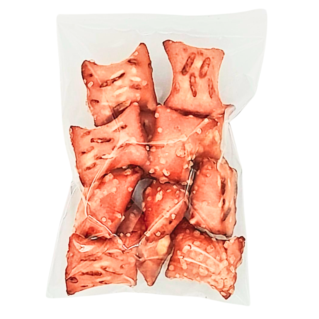 - 100 pzas de 50gr. de Pretzels rellenos de crema de cacahuate en bolsa transparente 100% reciclable (tipo celofán)