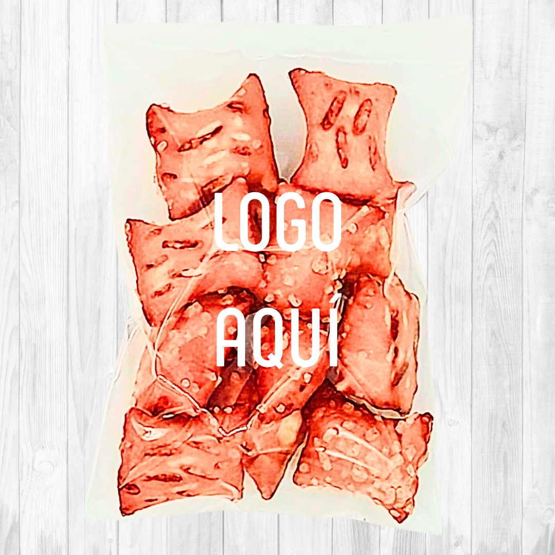 • 100 pzas de Pretzels rellenos de crema de cacahuate de 50gr. en bolsa transparente 100% reciclable (tipo celofán), personalizada con sticker